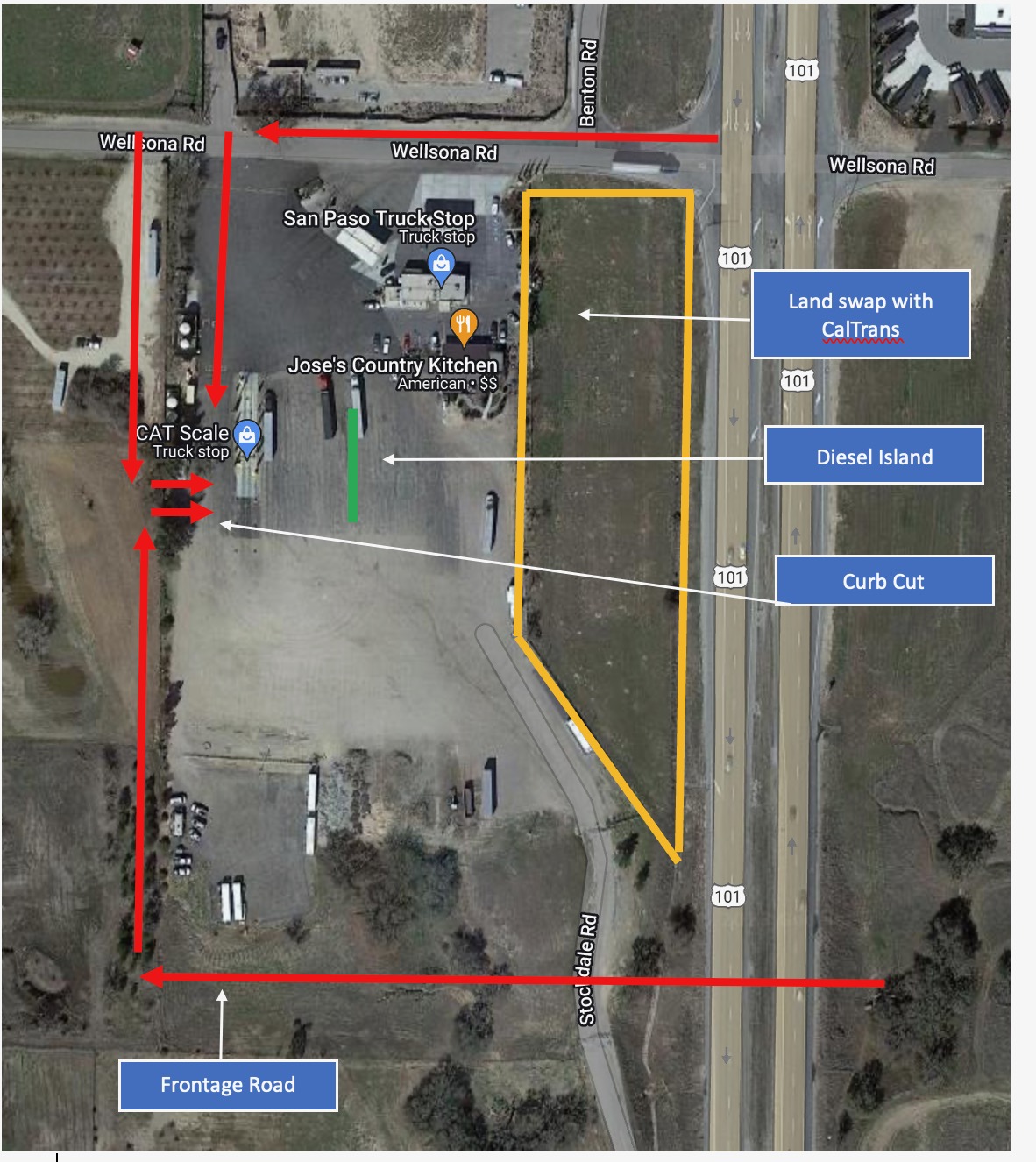 In 2022 Oasis Associates, Inc. was retained to provide a comprehensive analysis of the impacts and land use implications and facilitate in connection with the potential eminent domain land acquisition by the California Department of Transportation. Caltrans District 5 is proposing to construct an undercrossing and a new frontage road in the proximity of the intersection of State Route 101 with Wellsona Road in Paso Robles, in San Luis Obispo County. The purpose of the project is to reduce the number and the severity of collisions at this intersection of State Route 101. The proposed project significantly impacts San Paso Truck Stop.